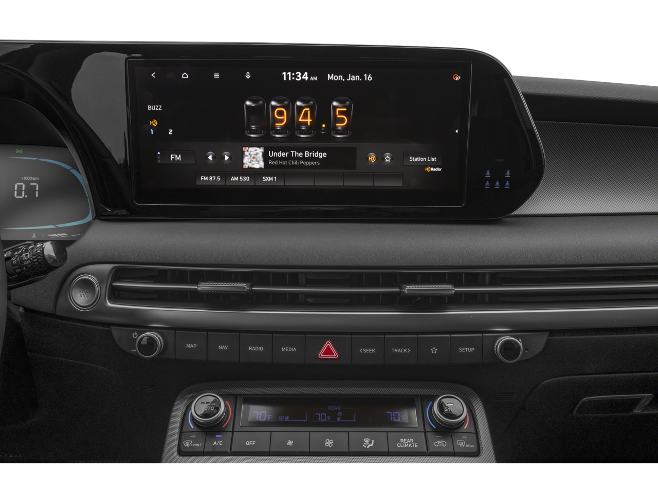 - Radio: AM/FM/MP3 Audio System -inc: 12.3" color touchscreen display, onboard navigation w/traffic flow including incident data via HD Radio (HERE), Over-the-Air (OTA) map updates, SiriusXM, USB, Android Auto and Apple CarPlay, dynamic voice recognition, rear seat quiet mode, Bluetooth® hands-free connectivity w/multiple device connection and Bluelink Connected Car System